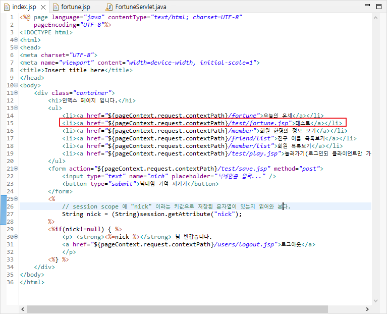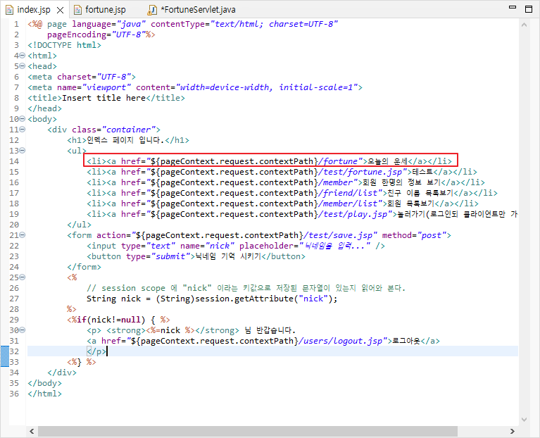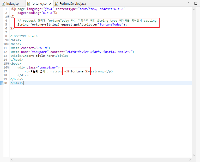 최종적인 목표는 FortuneServlet.java 파일안에 있는 String fortune 값을 jsp 으로 전달하여 보여지게 하는 것이다.