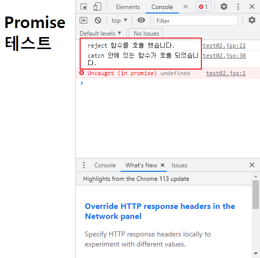 "catch 안에 있는 함수가 호출 되었습니다." 가 웹페이지의 console에 출력된다.