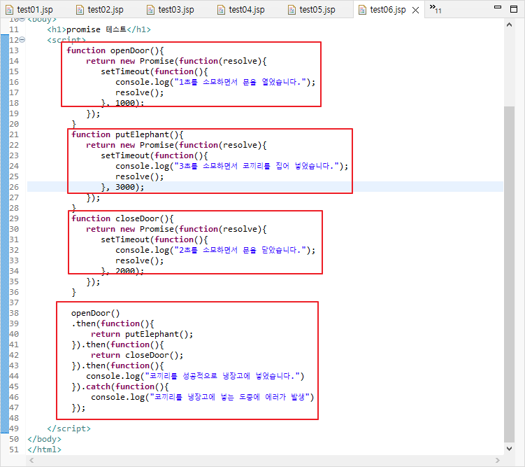 다음은 Promise() 메소드를 활용하여 작업순서에 맞춰서 일을 처리하는 로직이다.