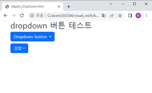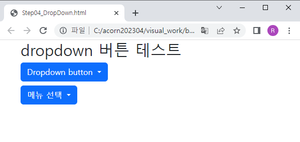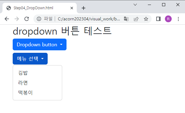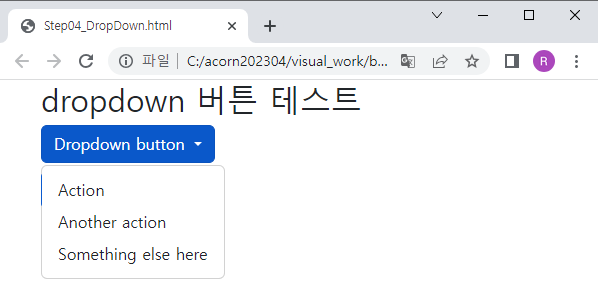 Dropdown button에 아직 동작을 추가 하지 않았기 때문에 항목을 클릭해도 아무런 동작이 없다.