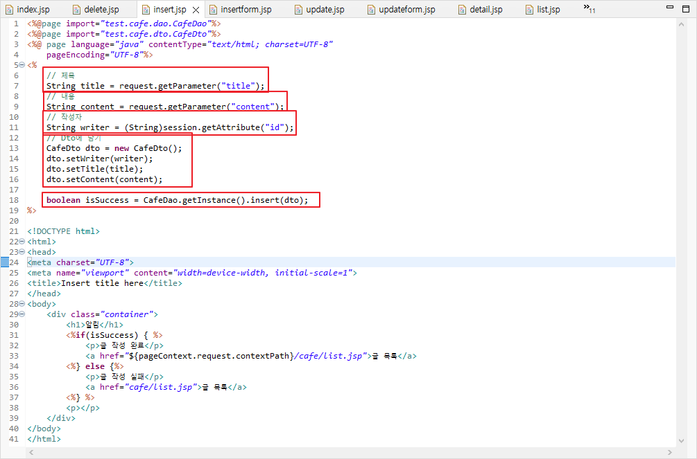 insertform.jsp 페이지에서 제목과 내용을 입력하고 저장 버튼을 누르면 form 의 내용이 insert.jsp 페이지로 전달된다.