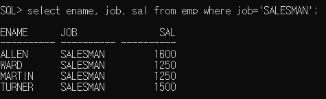 - emp 테이블에서 직업이 'SALESMAN' 인 사람들의 이름,직업,급여를 출력해 보세요(단 급여가 높은 순서대로)