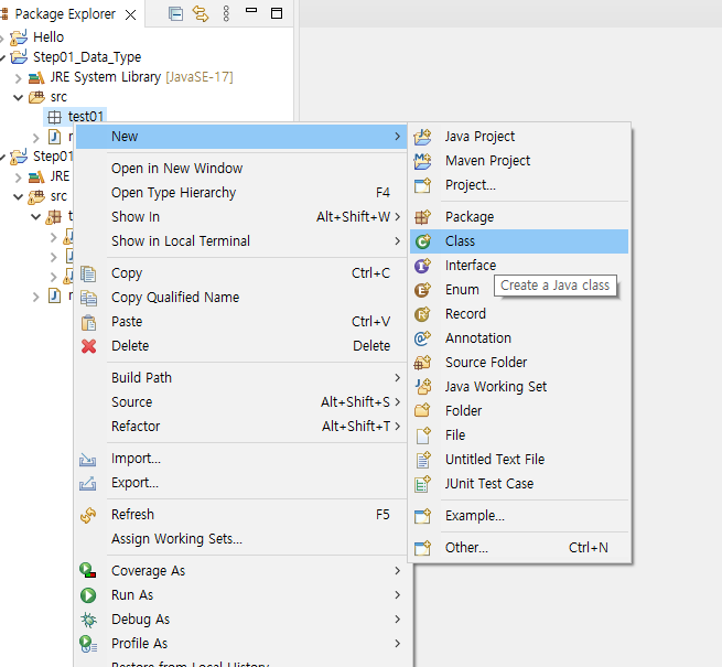4. 생성된 패키지 파일 오른쪽클릭 > New > Class 클릭
