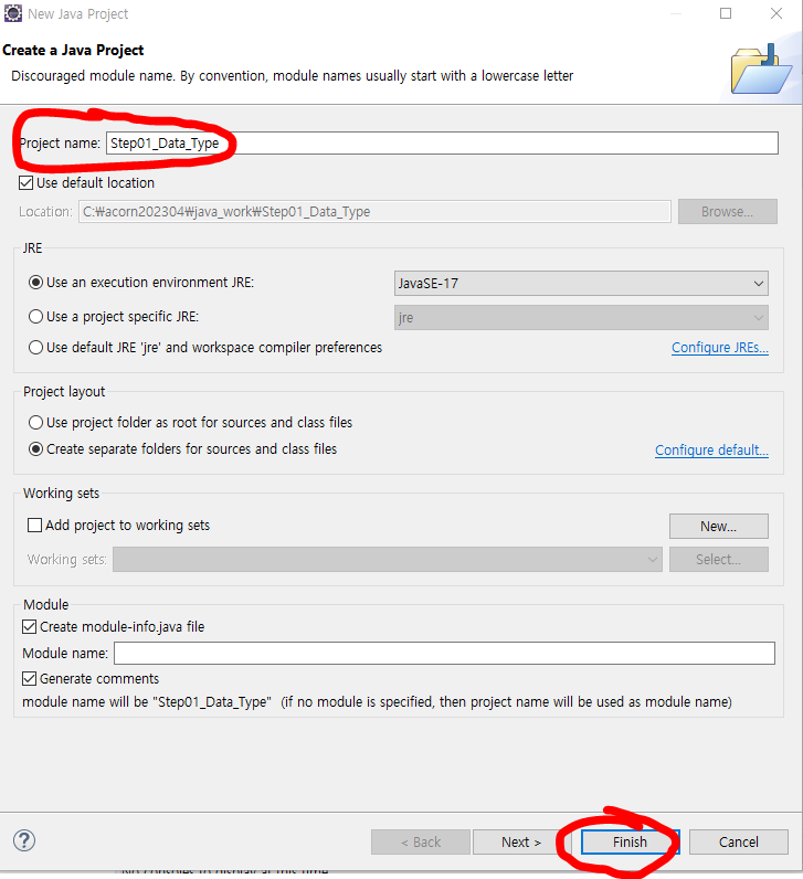 2. 프로젝트 이름 입력후 Finish 클릭