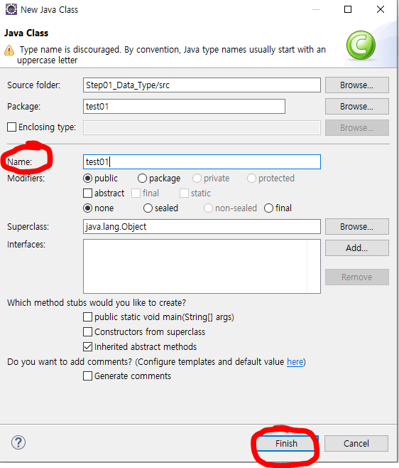 5. Class 이름 지정 후 Finish 클릭