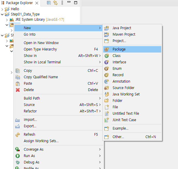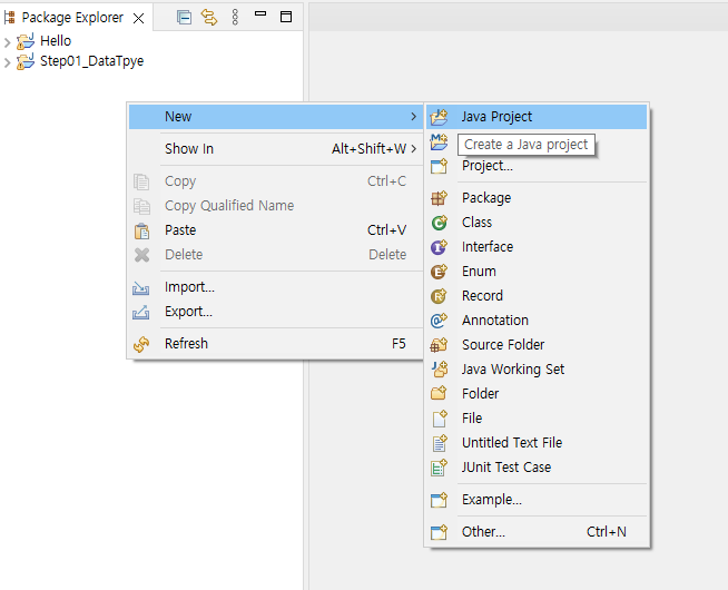 1. Package Explorer 창에서 마우스 오른쪽클릭 > new > java project 클릭