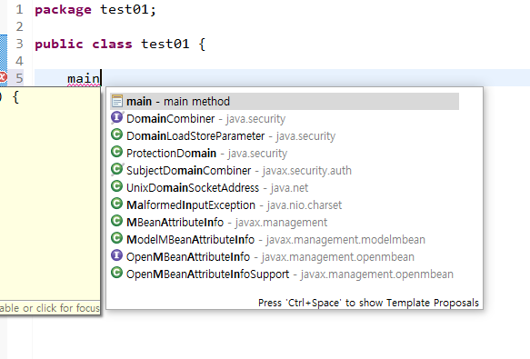 main 입력후 Control + 스페이스바 > 엔터 눌러서 main 메소드 생성