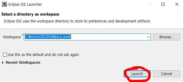 5. 파일을 저장할 Workspace 지정 후 Launch 진행