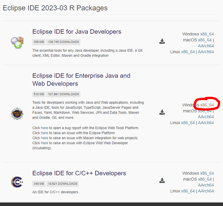 3. Eclipse IDE for Enterprise Java and Web Developers 을 자신의 PC 버전에 맞게 클릭 (아래 사진은 Windows 기준)