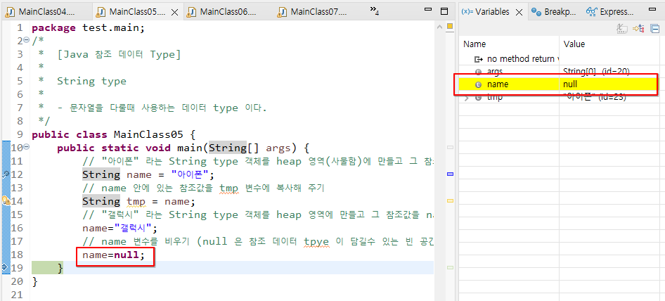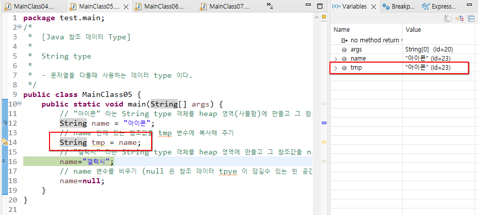 - tmp 이라는 변수에 String 타입의 값으로 name의 변수에 "아이폰" 으로 생성되었다.