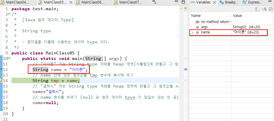 // "아이폰" 라는 String type 객체를 heap 영역(사물함)에 만들고 그 참조값을 변수에 담기