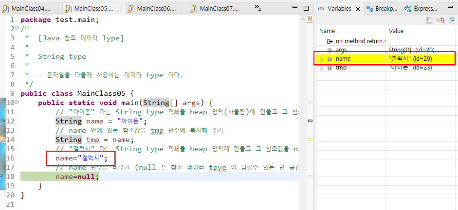 - "갤럭시" 라는 String 타입 객체를 heap 영역에 만들고 그 참조값을 name의 변수에 덮어씌웠다.