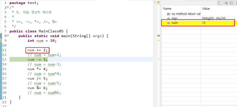 num = 10 에서 2를 더한 값인 12로 되었다.