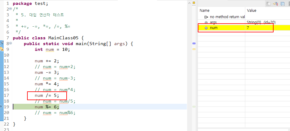 num = 36 에서 5를 나누어 소숫점을 제외한 값인 7이 되었다.