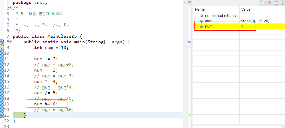 num = 7 에서 6으로 나누어 남은 나머지 값인 1이 되었다.