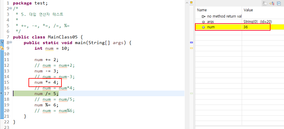 num = 9 에서 4를 곱한 값인 36이 되었다.