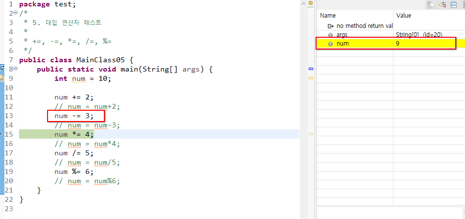 num = 12 에서 3을뺀 값인 9가 되었다.