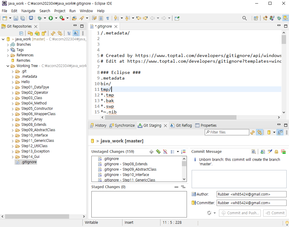 새 웹페이지로 위와 같이 로딩 되면 텍스트를 모두 복사 하고 .gitignore 에 /.metadata/ 밑에 붙여넣기 한다.