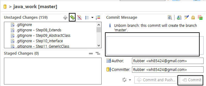 git Staging 탭에서 ++ 버튼을 누른 후 commit 내용을 적은후 우측하단 Commit 버튼을 누르면 성공적으로 커밋이 된다.