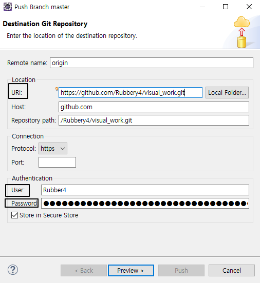 Password에 key 값을 적어주고 프리뷰를 누르고 최종적으로 push버튼을 누르면 된다.
