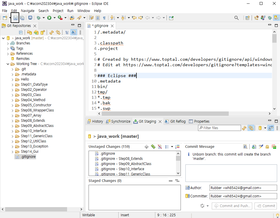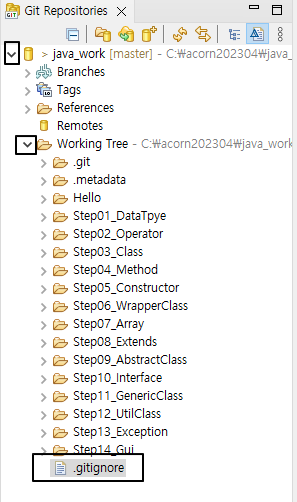 아래 화살표를 클릭하여 .gitignore 파일을 클릭한다.