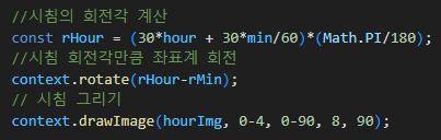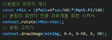 4. setInterval 함수 안에 분침의 회전각을 계산하여 회전각 만큼 좌표계를 회전시키는 동작을 부여한다.