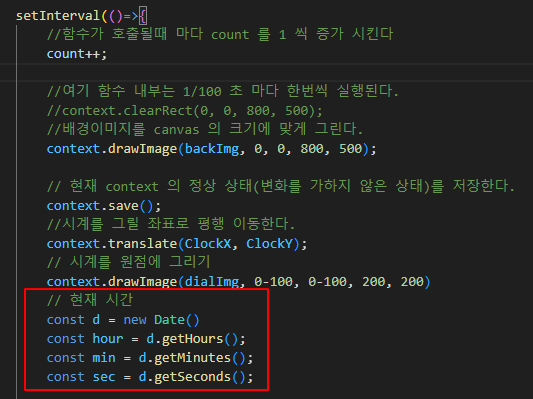 5. setInterval 함수 안에 시침의 회전각을 계산하여 회전각 만큼 좌표계를 회전시키는 동작을 부여한다.