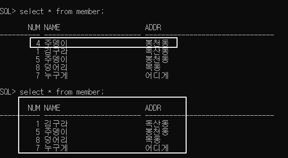 실행결과 orcle scott 계정 member table에 num 4번 테이블의 값이 삭제 된 모습이다.