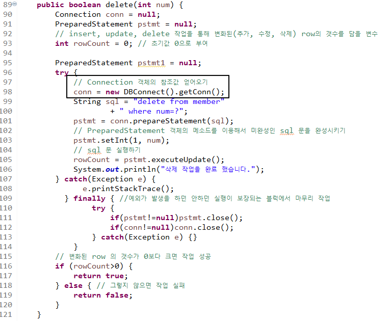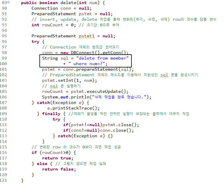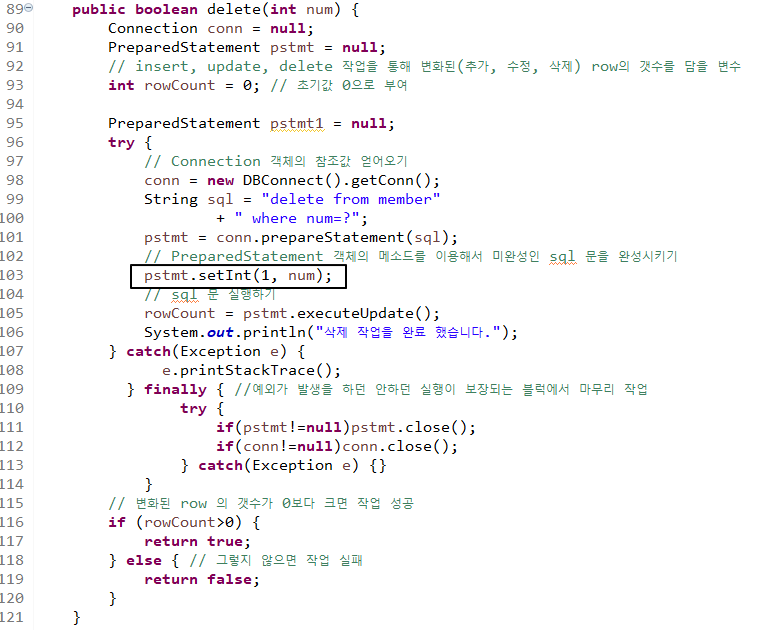 3. boolean 타입의 daoDelete에 삭제 작업을 실행할 메소드를 담고 if문에서 실행시킨다.