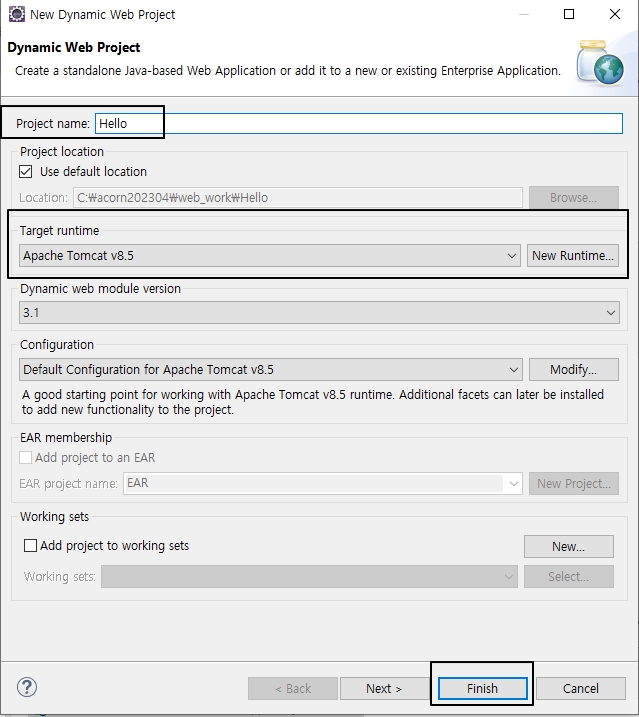 생성할 프로젝트 이름과 Tomcat 버전 확인한뒤 Finish