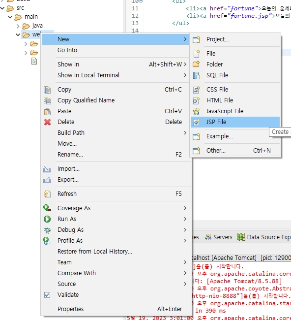 jsp 파일을 생성하고 싶은 위치에서 오른쪽 클릭 > New > JSP File 클릭