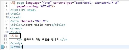 생성된 기본 템플릿이며 JSP 파일안에선 <% %> 표현으로 <% %>사이에 자바 코드를 입력 하여 동작하게 할 수 있다.