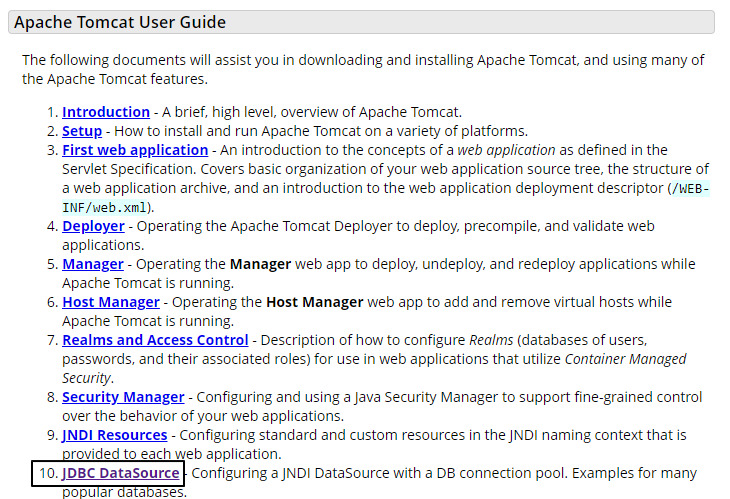 Apache Tomcat User Guide 에서 10번 JDBC DataSource 클릭