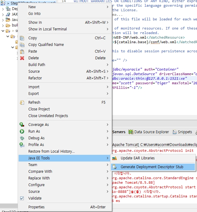 DB 연동할 프로젝트에서 마우스 오른쪽클릭 > Java EE Tools > Generate Deployment Descriptor Stub 클릭