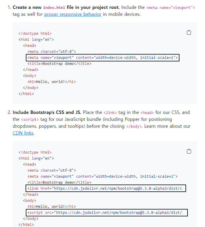 표시한 구문들을 입력 하면 bootstrap 사용 준비 완료이다.
